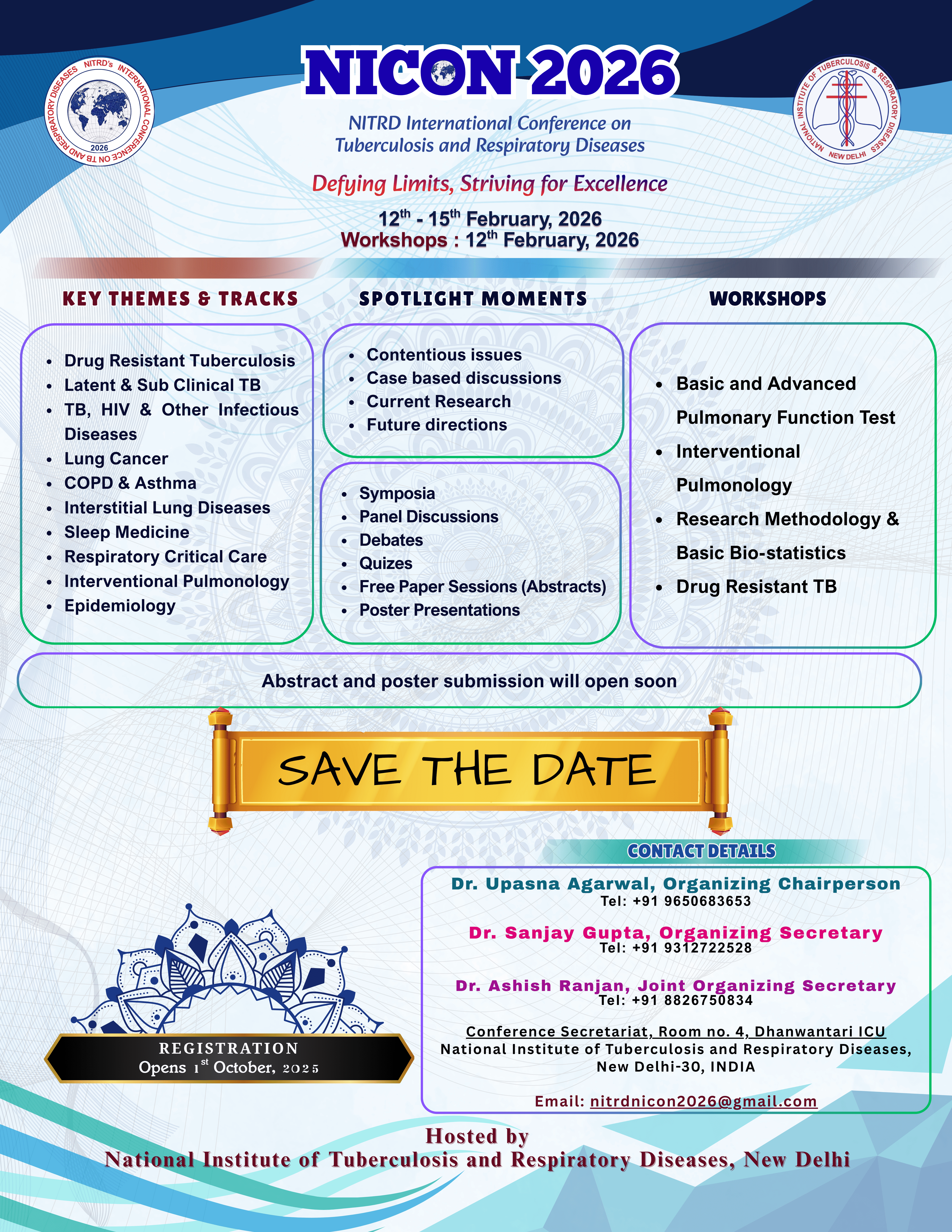 It is with immense pleasure that I invite you to the NITRD, International conference on Tuberculosis and Respiratory Diseases, to be held from February 12-15, 2026, at the National Institute of Tuberculosis and Respiratory Diseases (NITRD), New Delhi.